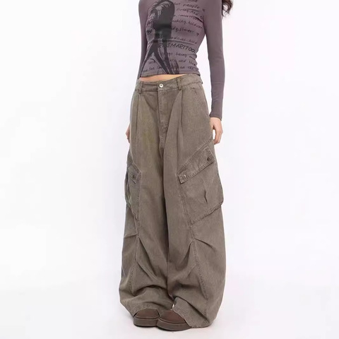 Hip-Hop American Retro Denim Lavado Arrugado Bolsillo Transfronterizo Venta caliente Street Dance Unisex Wide-Leg Cargo Otoño